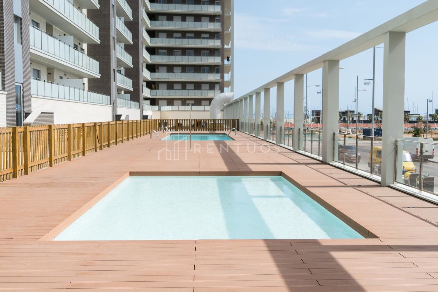 Con 92m2 distribuidos en un amplio salón comedor, cocina, dos habitaciones, dos baños, y una amplia terraza. Las dos habitaciones son dobles, una de ellas cuenta con armario empotrado y baño en suite. Todas las estancias son exteriores y dan a una terraza de 17 m² con vistas al mar y al puerto de Badalona.