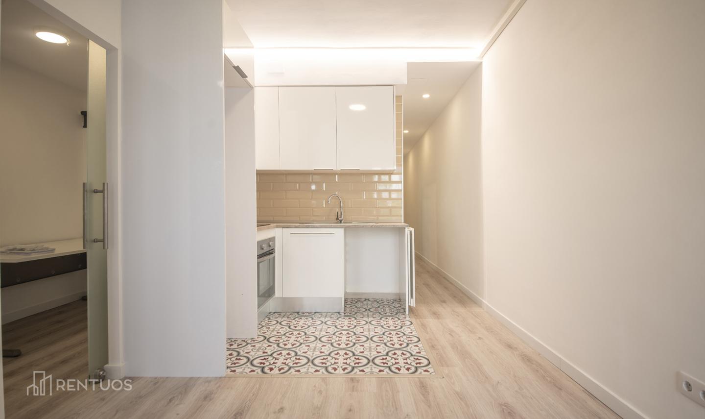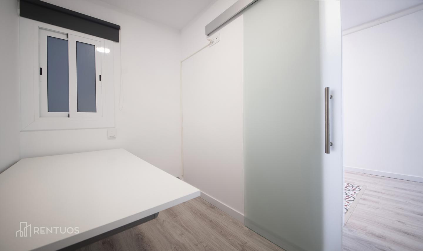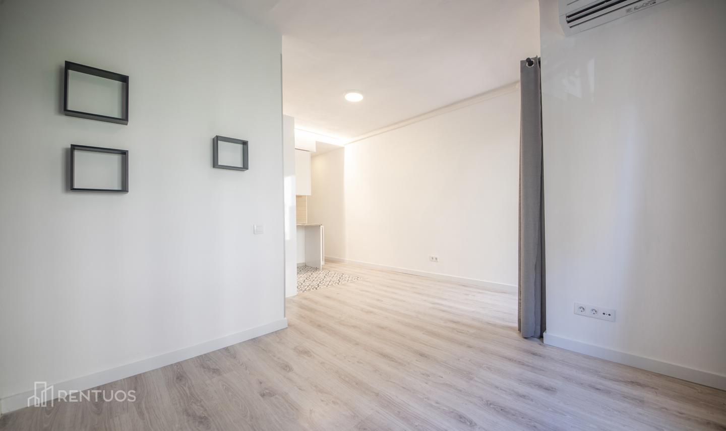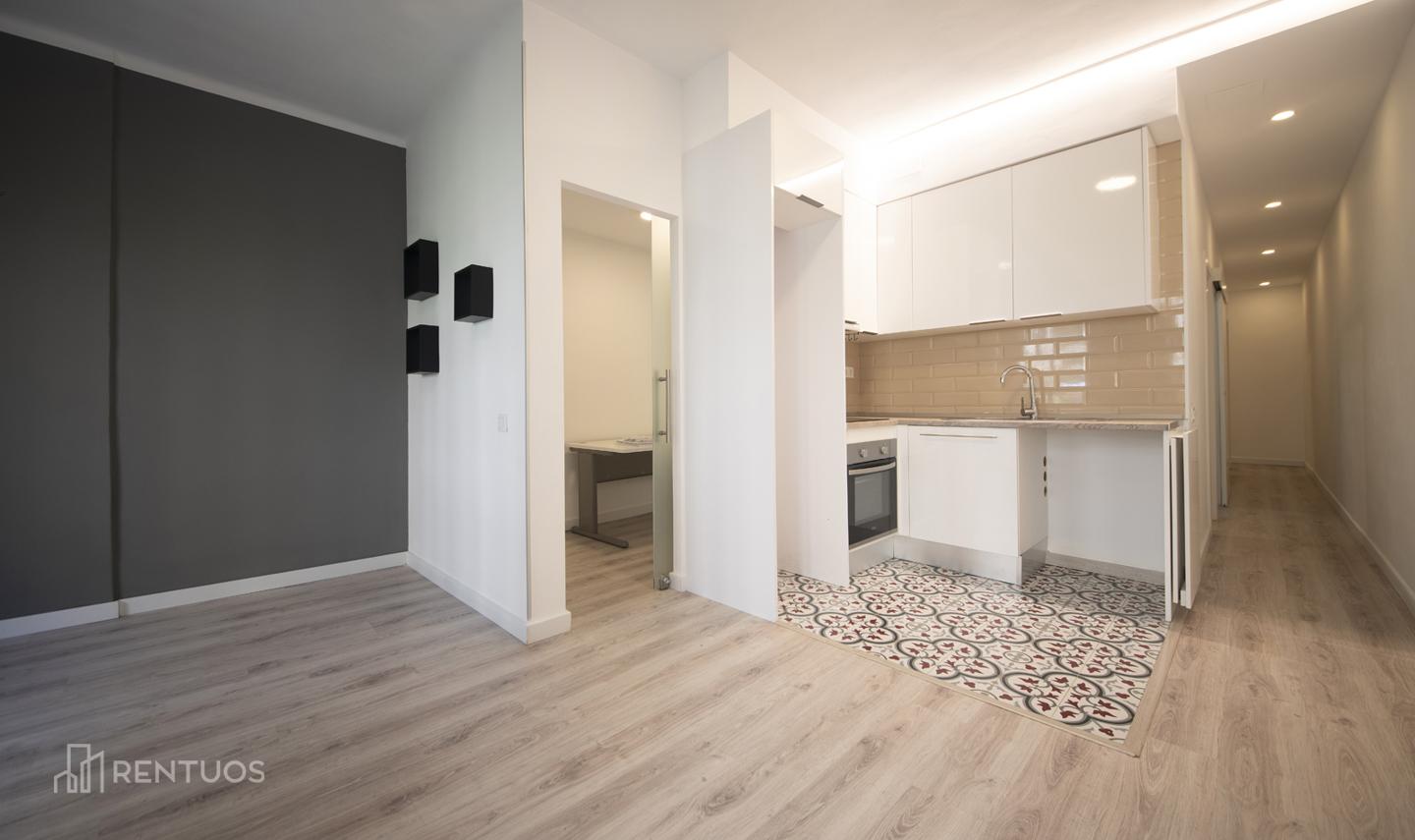 Piso reformado de 58m2 distribuidos en 2 habitaciones, 1 despacho, 1 baño y un salón con cocina abierta.