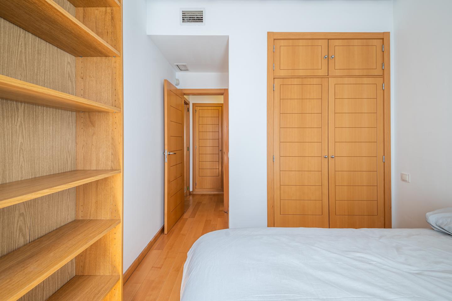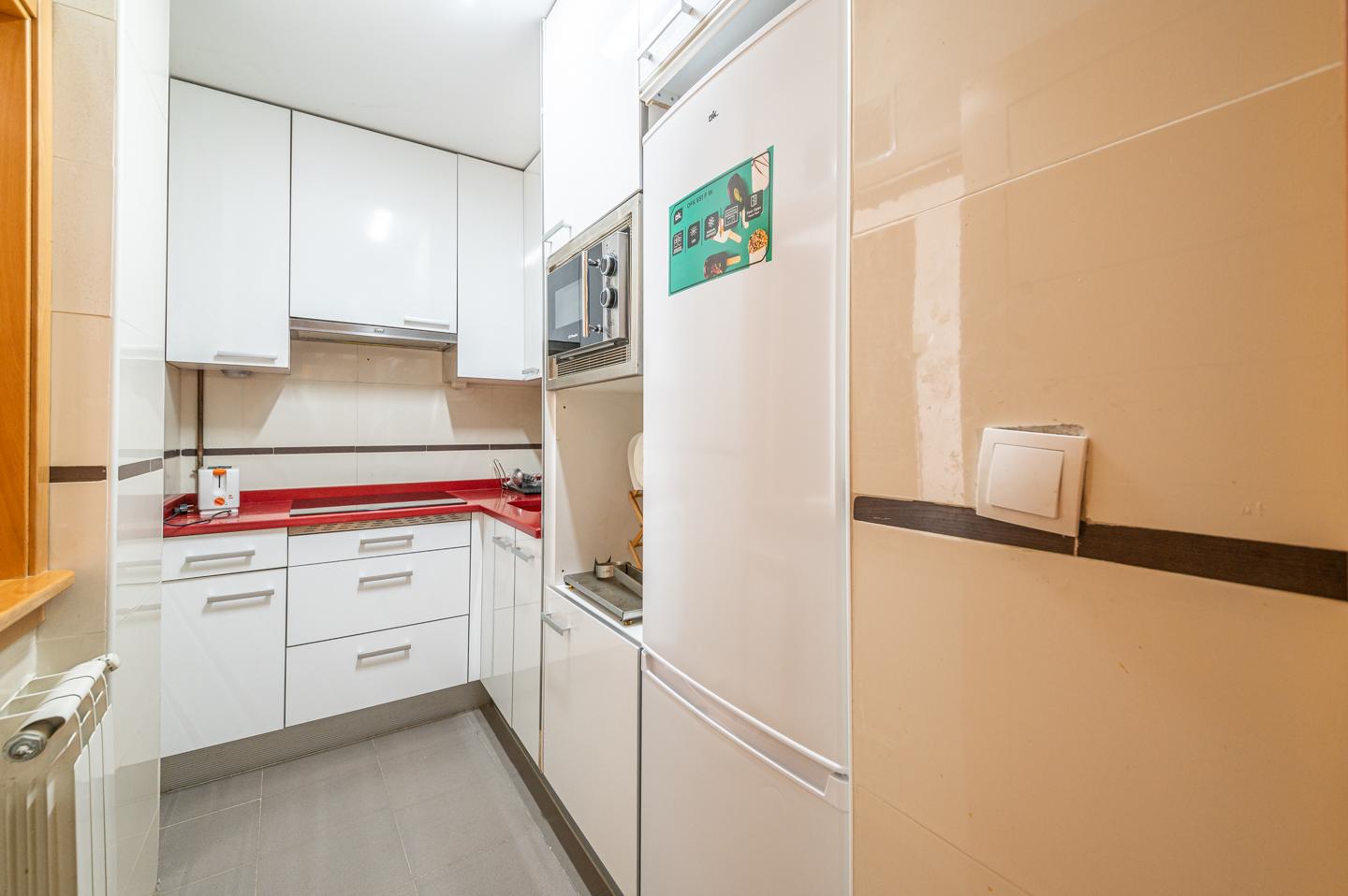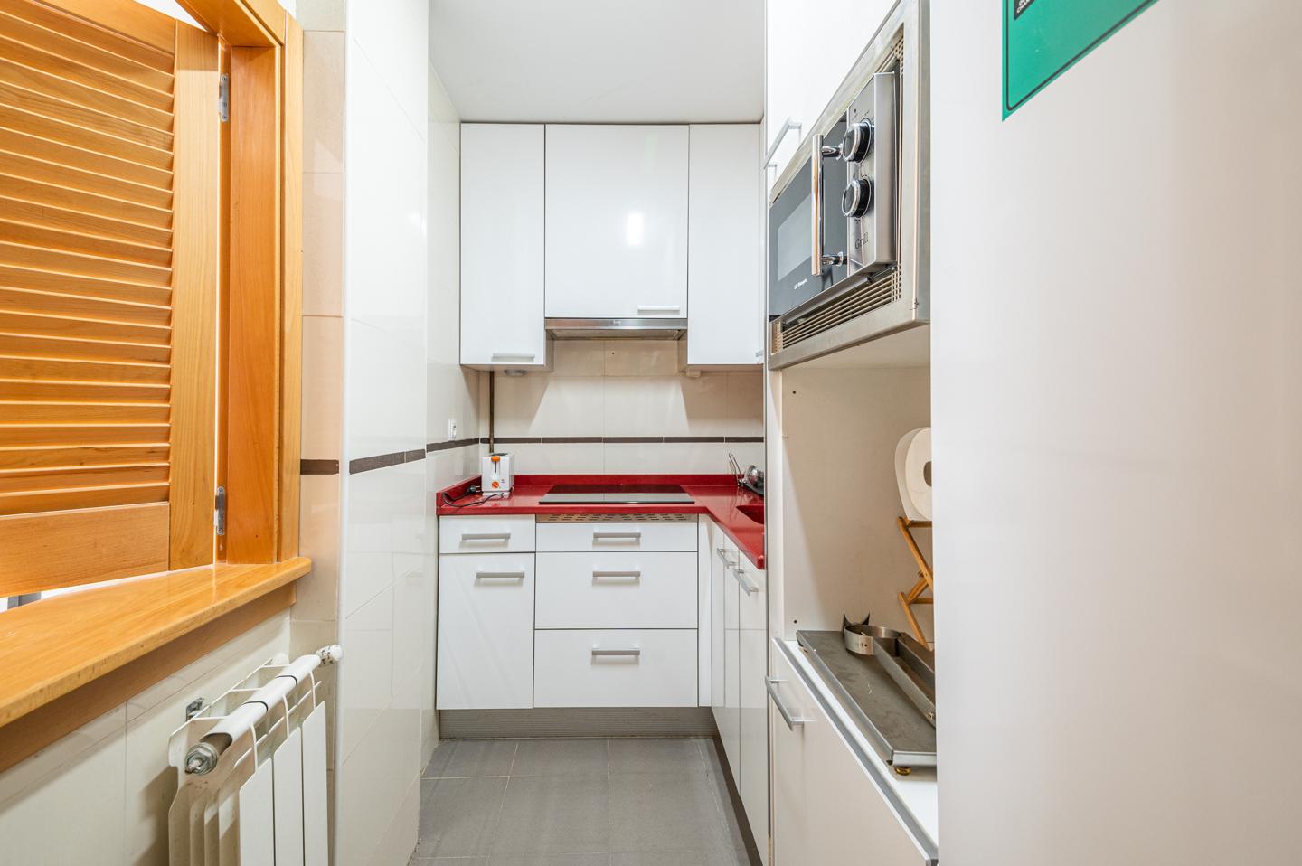 Desde el recibidor se accede a un amplio salón-comedor completamente amueblado. La cocina está equipada con electrodomésticos (nevera y microondas) y se conecta con el salón por una práctica ventana. La habitación principal tiene armario empotrado y estanterías. El baño es espacioso y dispone de bañera.