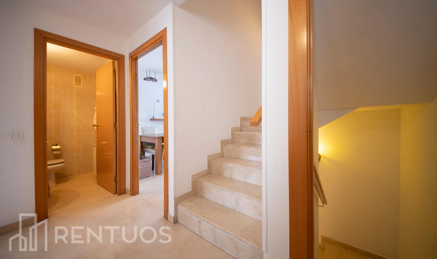 Esta vivienda de 175m² está distribuida en 3 plantas. En la planta principal, nos recibe el espacioso salón-comedor con salida a terraza con dos niveles, la cocina, que está equipada con todos los electrodomésticos necesarios, y un aseo.