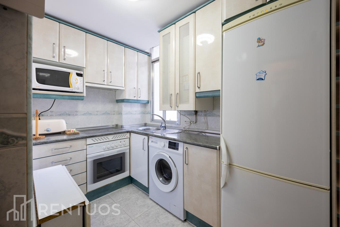 Descubre este encantador piso de 62 m2, ubicado en la cuarta planta de un edificio tranquilo y familiar. La vivienda se distribuye en un hall de entrada que da paso a un luminoso salón con acceso a una agradable terraza, ideal para relajarse o disfrutar de comidas al aire libre. La cocina es independiente y exterior, completamente equipada con vitrocerámica de cuatro fuegos, horno, lavadora y nevera, además de contar con una práctica mesita plegable.